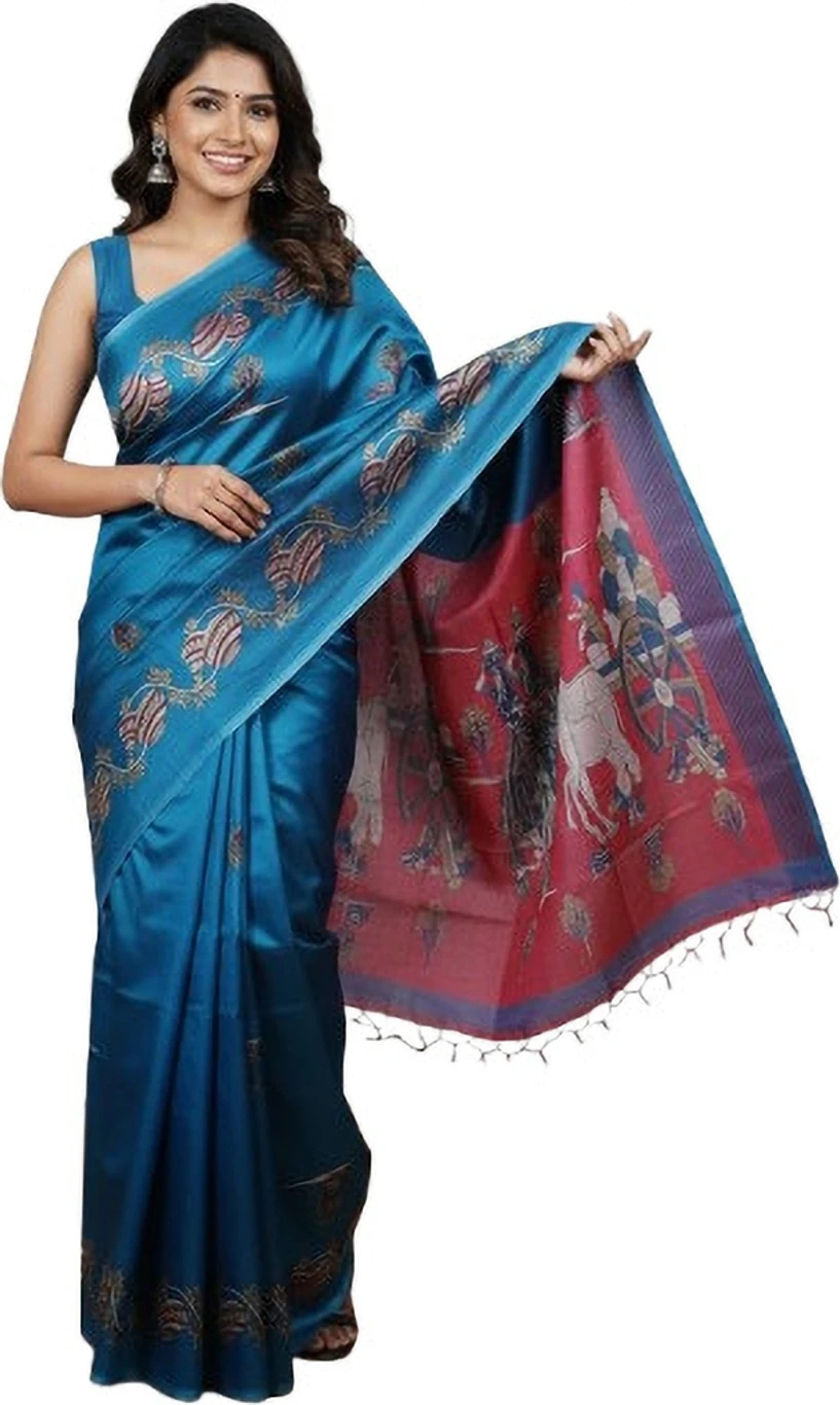 Mohar Printed, Hand Painted Kalamkari Silk Blend Saree (Blue) brings together traditional Kalamkari-inspired artistry with a practical silk blend fabric. It features a smooth texture with a light sheen, giving the saree a neat and refined appearance suitable for regular use.