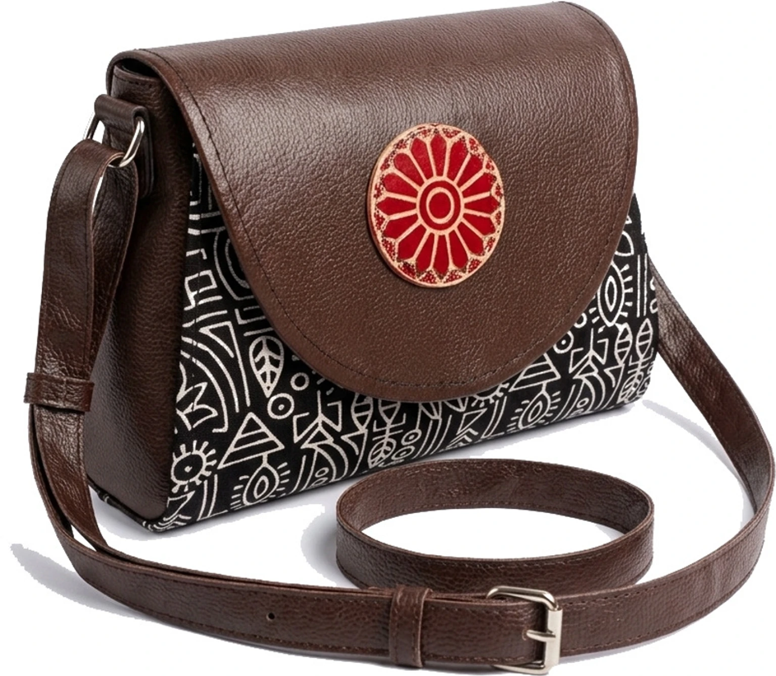 This stylish sling bag features a rich brown base paired with a vibrant circular multicolor ethnic motif on the front. The warm tone combined with traditional detailing gives it a subtle yet classy look, perfect for both casual and ethnic wear.